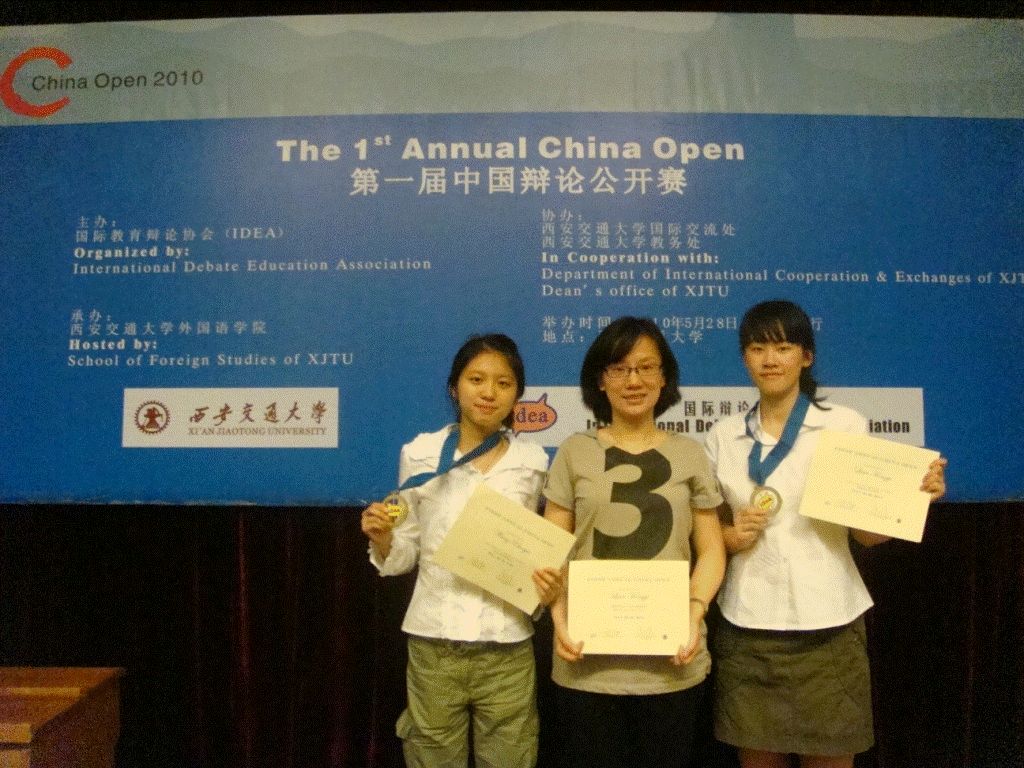 2010年5月28日至5月30日,由IDEA(国际辩论教育协会)、西安交通大学外国语学院主办,西安交通大学英语公共演说协会(PSA)协办的首届China Open国际辩论中国公开赛于在西安交通大学举行。